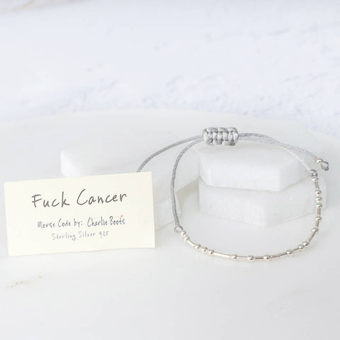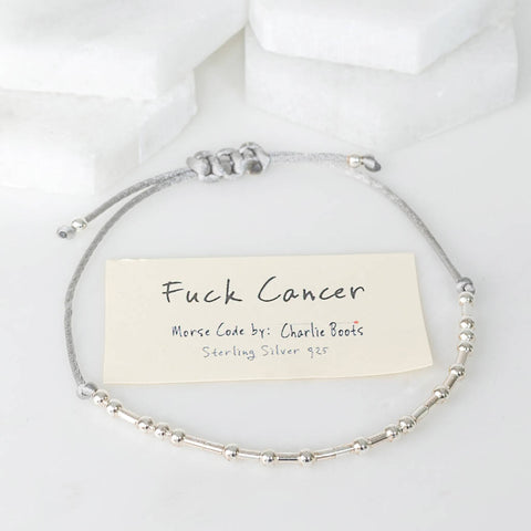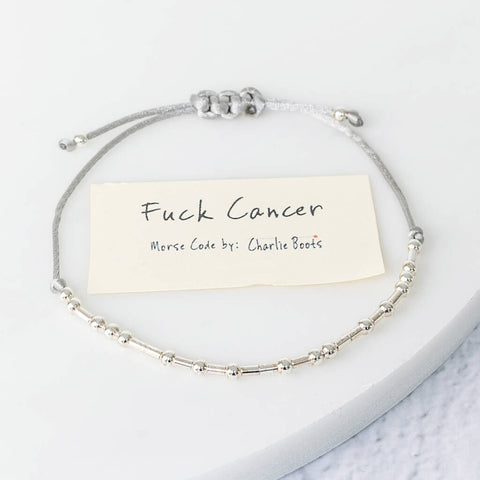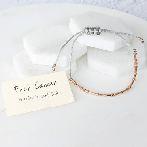 A Morse code bracelet that spells 'Fuck Cancer' in dots and dashes.
