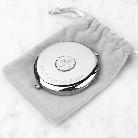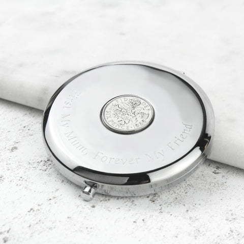 A personalised compact mirror decorated with a 1955 70th birthday sixpence coin.